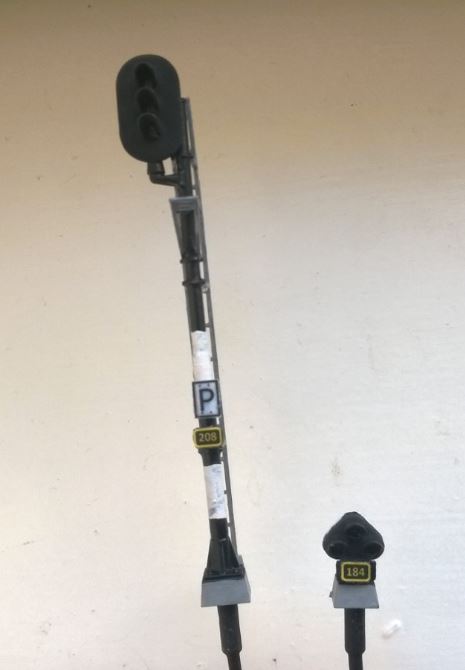 na een schilderbeurt zijn ze op de baan geplaatst. In de ""standaard NS library voor de OC32 (module waarmee lampjes, wissels en servo's worden aangestuurd) is de lampwisseling van "P-seinen" opgenomen. Een "P-sein" (Permissief sein, herkenbaar aan het zwart-witte "P" bordje) staat langs de vrije baan en "in rust" op groen. Bij passeren valt het "P-sein" van groen, via kort geel op rood. Echter, voor bediende seinen klopt dit niet. Bediende seinen staan op emplacementen en staan "in rust" op rood. Bediende seinen gaan bij bedienen van rood via kort geel naar groen en vallen bij passeren direct op rood. Deze lichtwisseling heb ik zelf voor de OC32 geprogrammeerd. Klein detail, maar maakt wel dat het seinstelsel bij mij precies de seinbeelden toont zoals "buiten". (En raak je als spoorman niet in de war).