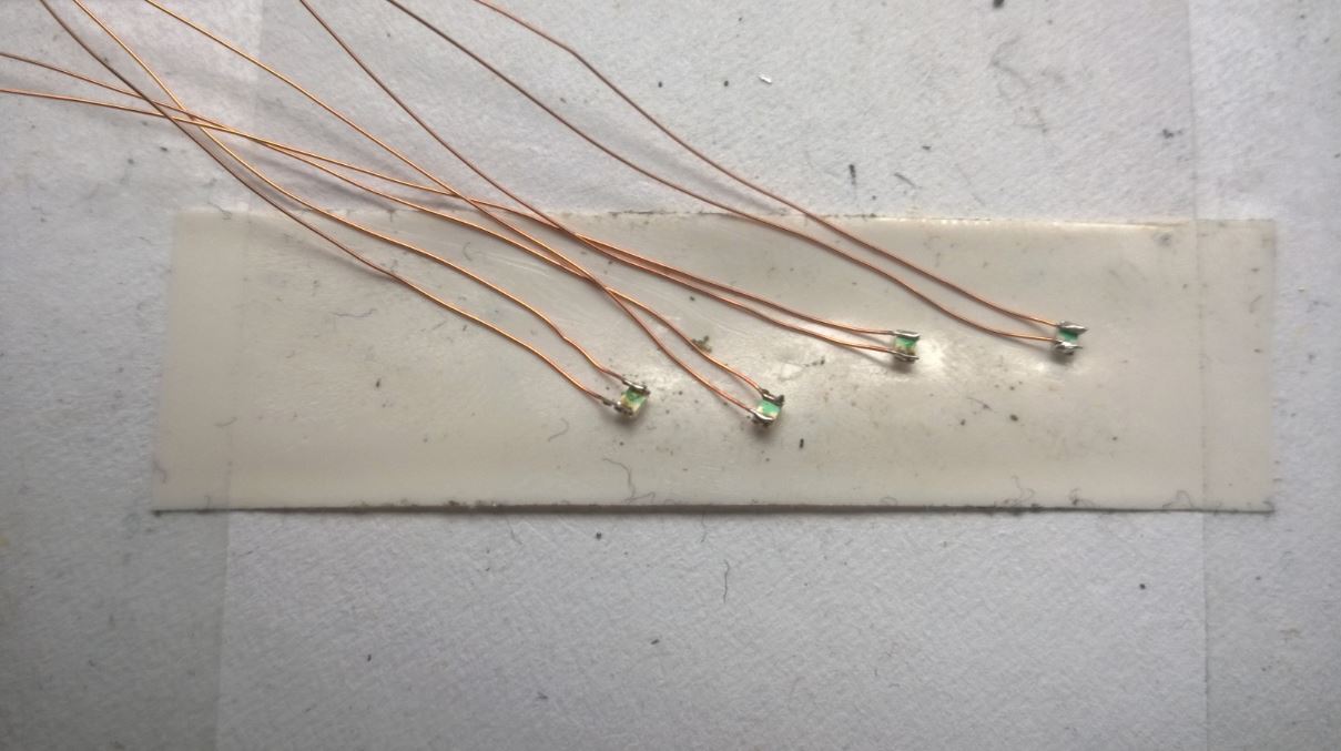 De ledjes zijn +/- 1x2mm groot en voor gebruik moeten er eerst lakdraadjes aan gesoldeerd worden. Hulp hierbij is een deksel van een schoenendoos, dubbelzijdig tape en een soldeer station. O ja, en een veel licht voor de ouder wordende ogen...