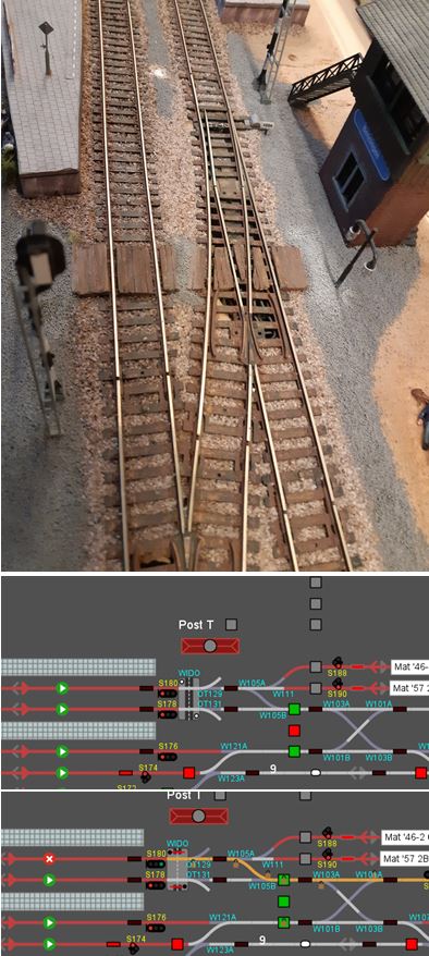 Het pad is beveiligd met een zelf gebouwde WiDo lampen installatie. De lampen branden constant als er veilig overgestoken kan worden en gaan knipperen zodra een rijweg over het pad is ingelegd. Voor de aansturing van de lampen is een nieuw device voor de OC32 geprogrammeerd. Voor gebruik via iTrain moest er ook gepuzzeld worden. Hier was de oplossing om een extra wissel als "ontspoor tong" in de perron sporen op te nemen. In rust (geen rijweg er overheen) heeft een ontspoor tong de voorkeur stand "afbuigend". Bij inleggen rijweg komt de tong "rechtdoor" en aan die stand is in iTrain een relais gekoppeld wat de WiDo ontsteekt. Nadat de trein de rijweg heeft afgereden komt de ontspoortong weer in de ("afbuigende") voorkeur stand en de daaraan gekoppelde WiDo toont weer "veilig".