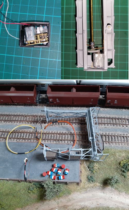 Bediening gaat ouderwets met twee ompool schalelaars met middenstand en een hoofdschakelaar. De motor voor de loopkat komt uit een defecte servo, de haak via een standaard micro motor met vertragingskast. De lampjes onder de kraan schakelen pas in als zowel de hoofdschakelaar en de emplacement verlichting "aan" worden gezet. En natuurlijk past alles net niet (recht), maar daar zie je tijdens gebruik niets van. Lees hier de complete verbouwing. Bekijk hier het filmpje van de werkende overslagkraan