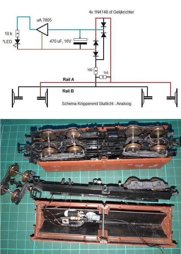 Gewoon ouderwetse techniek, (Geen SMD) weggewerkt waar er mogelijkheden zijn. Ook twee assige (Roco) HBs wagons en een platte rongen wagen (met container erop voor de schakeling) hebben een knipperend lampje gekregen. Probleem opgelost van de twee assige wagons: de beide enkelzijdig geisoleerde assen hebben een detectie weerstand en verzorgen ook de stroomafname. Iedere as heeft aan één zijde een flexibel stroomslepertje gekregen om de beweegbare (enkele) as te blijven volgen.