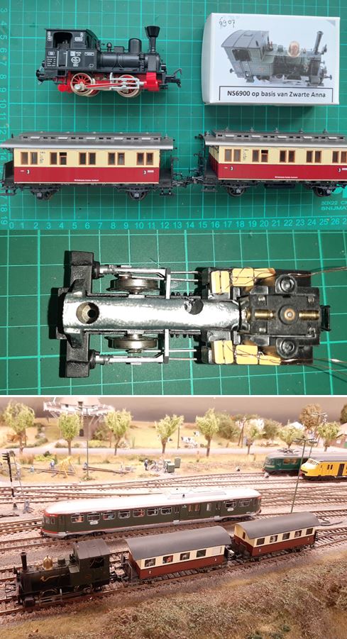 NS 6907 van een Fleischmann "Zwarte Anna" en GmenS kitje. Gedigitaliseerd, stroombuffer van 10x SMD elco 100uF/16V, verlichte (metalen) lantarens, vuurkorf imitatie door 4x SMD led. Helaas gaat er steeds een SMD tantaal elco'tje stuk, dus het spul staat nu aan de kant, wachtend op een goed werkende oplossing... Wagons zijn 2e hands Roco's en flink verbouwd. Rezigers en verlichting erin, nu nog de blakons vullen met "kijkers en zwaaiers". Deze loc reed vroeger tussen Ede en Wageningen (via de Mouterij naar het inmiddels verdwenen station), via mijn huidige woonplaats. Op de achtegrond een 2e museum stel, een uit Lima en Mastica resten gebouwde omBC2900.