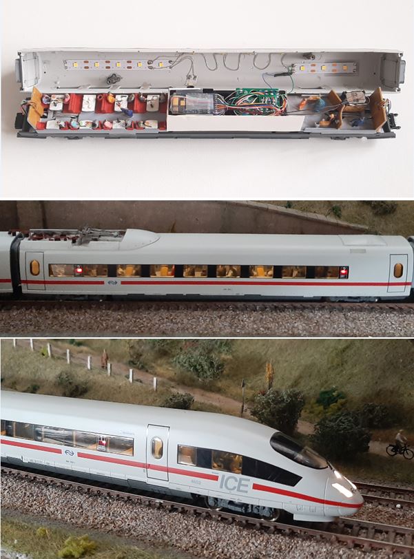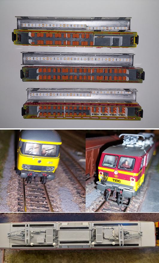 Boven: Het restauratie rijtuig voorzien van dinerende reizigers, compleet met borden, bestek en glazen op tafel. Achter de vier ramen van het bar gedeelte is een lichtscherm geplaatst, zodat de ramen -net als alle andere ramen- verlicht zijn en in de trein niet meer opvallen. Misschien komt er nog een fotootje van het originele interieur op. De luidspreker zit achter het dichte deel van de bar verstopt. Midden: Rijtuig voorzien van geschilderd interieur en verlichting (geschakeld met twee diodes op de seinverlichting). Alle wielen nemen stroom af met extra slepers en geven dat door via de vijf polige koppelingen. De zwarte vlakken achter de ramen zijn op de (grijze) kap ook nog zwart gemaakt. Rotklus, alle ramen verwijderen /terugplaatsen, maar wel de moeite waard i.v.m. voorkomen van "grijs" doorschijnen van de kap. Let ook op de rode "led bestemming displays", met nagellak rood gemaakte led uit de verlichtings strip, achter een rechhoekig gevijld gat in wand gelijmd. Alle wielen zijn voorzien van ge-etste schijfrem imitatie schijfjes. Onder: De voorruit van de stuurstanden is voorzien imitatie zonnescherm. Dit is aan de binnenkant van de voorruit geschilderd en natuurlijk meteen een machinist op de bok geplaatst.