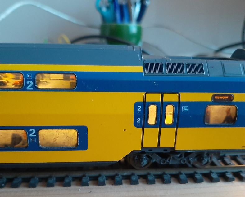 De Motorwagen heeft ook beneden verdieping (rond het ballast blok) verlichting op de balkons (rond de kardan assen). Mogelijk gemaakt door lichtschermen, waar nodig voorzien van gefotografeerde reizigers. Het stel is voorzien van een extra tussenbak, waar de pantografen van de mBvk's naar zijn getransplanteerd. (RailHobby artikel). De foto toont de mBvk1 (motorwagen) met (beneden, de gefotografeerde) reizigers en verlichting. Boven een enigzins bolle zelfbouw "interieur plank" die de motor en led's voor het lichtscherm van de beneden verdieping afdekt.