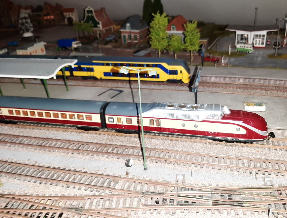Er is ook meteen machine kamer verlichting aangebracht. Op de tafels van het restauratie rijtuig komen nog extra details in de vorm van borden, bestek, glazen en menu kaarten. Lees hier de complete ombouw en bekijk hier een filmpje van het vol-gas vertrekkende en met fluitende turbo's rijdende treinstel.
